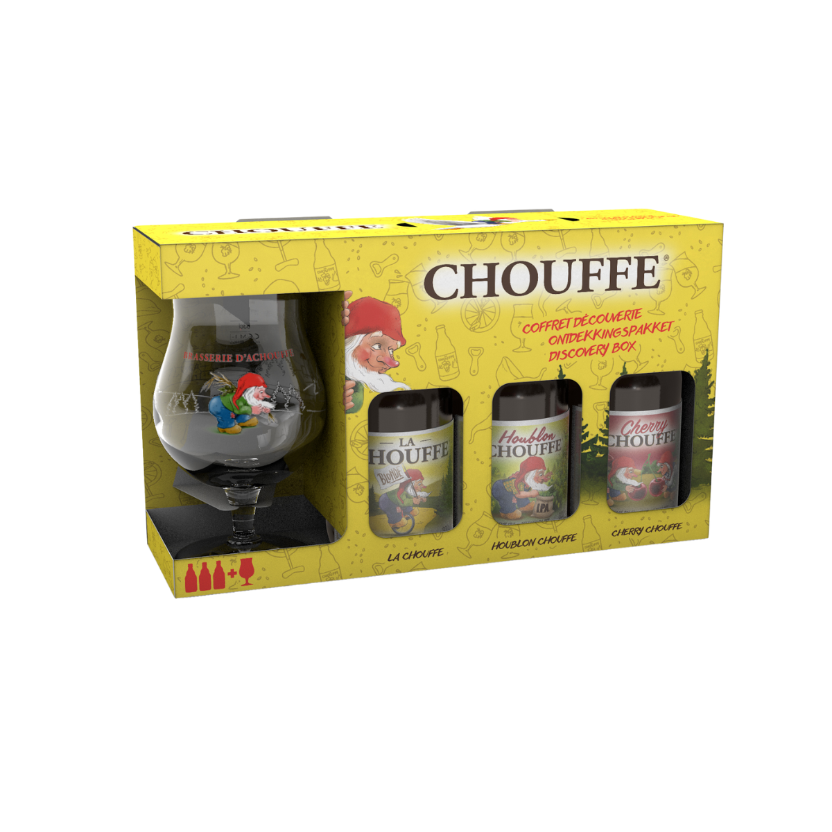 Komplekt kolmest erinevast Chouffe brändi õllest- La Chouffe, Cherry Chouffe ja Houblon Chouffe ning juurde sobivast klaasist joogi nautimiseks.