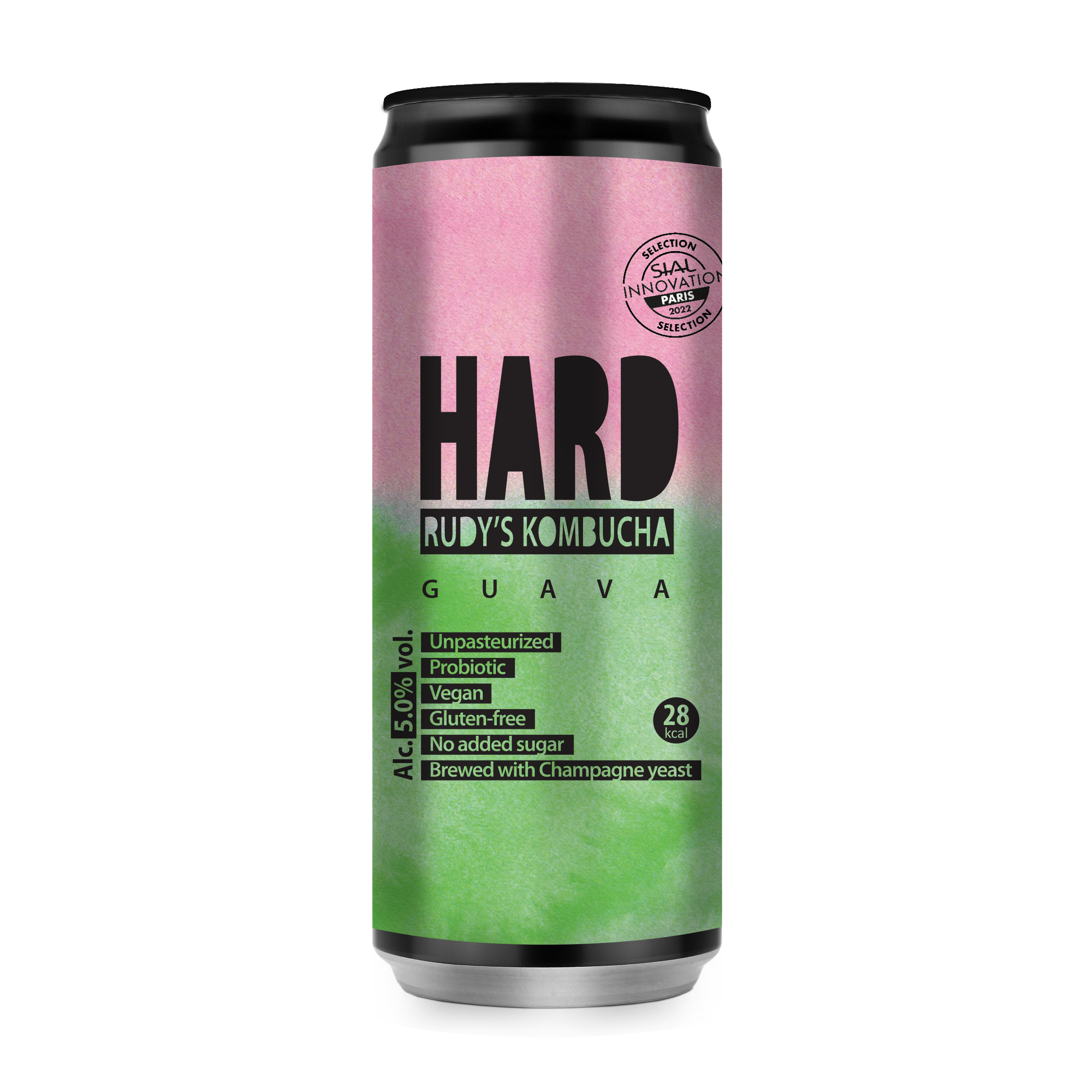 Looduslikult kolmekordselt kääritatud kombucha SCOBY ja šampanjapärmiga, rohelise tee ja 100% guajaavipüreega ilma lisatud suhkruta.